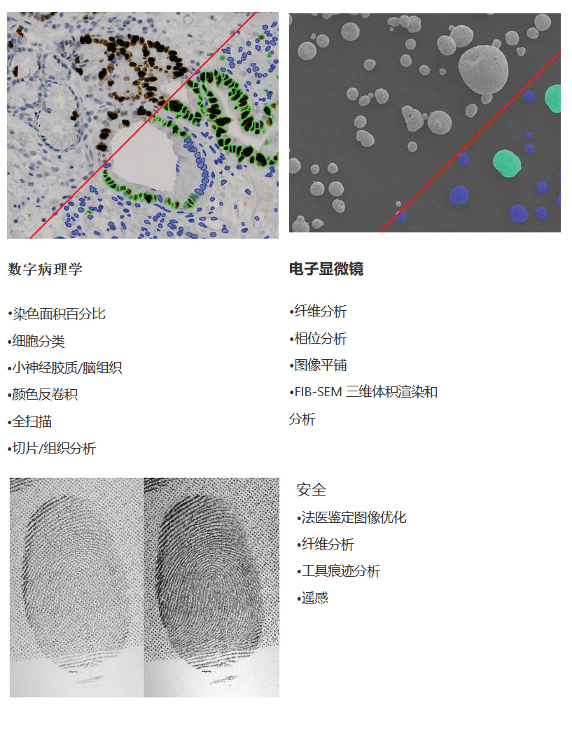 病理显微图像分析;面积形态和光密度分析;免疫组化;荧光图像分析;确走凝胶DNA中的含量;粒子计数分析;材料检测;质量OC;表面分析;图文资料和图谱库管理